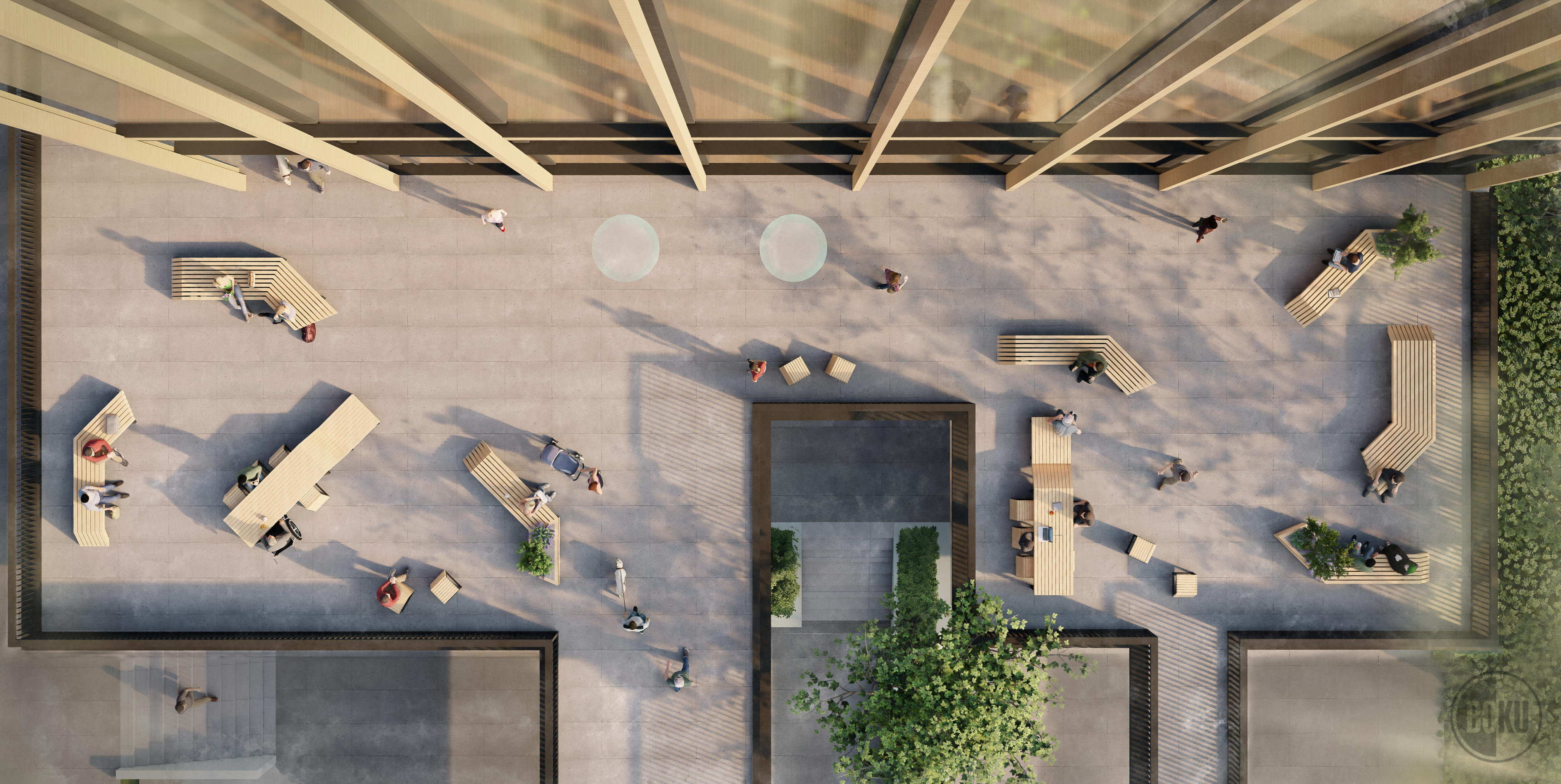 In dem Konzept sind die Fassadenstrukturen des Neubaus aufgenommen und auf den Vorplatz projeziert. An dem entstandenen Raster orientiert sich die Anordnung der verschiedenen Module. Die geschaffenen Räume sollen verschiedene Möglichkeiten für den Aufenthalt bieten: vom kurzen Verweilen bis zur längeren Mittagspause. Eine besondere Herausforderung dabei war die sehr niedrige max. Auflast.