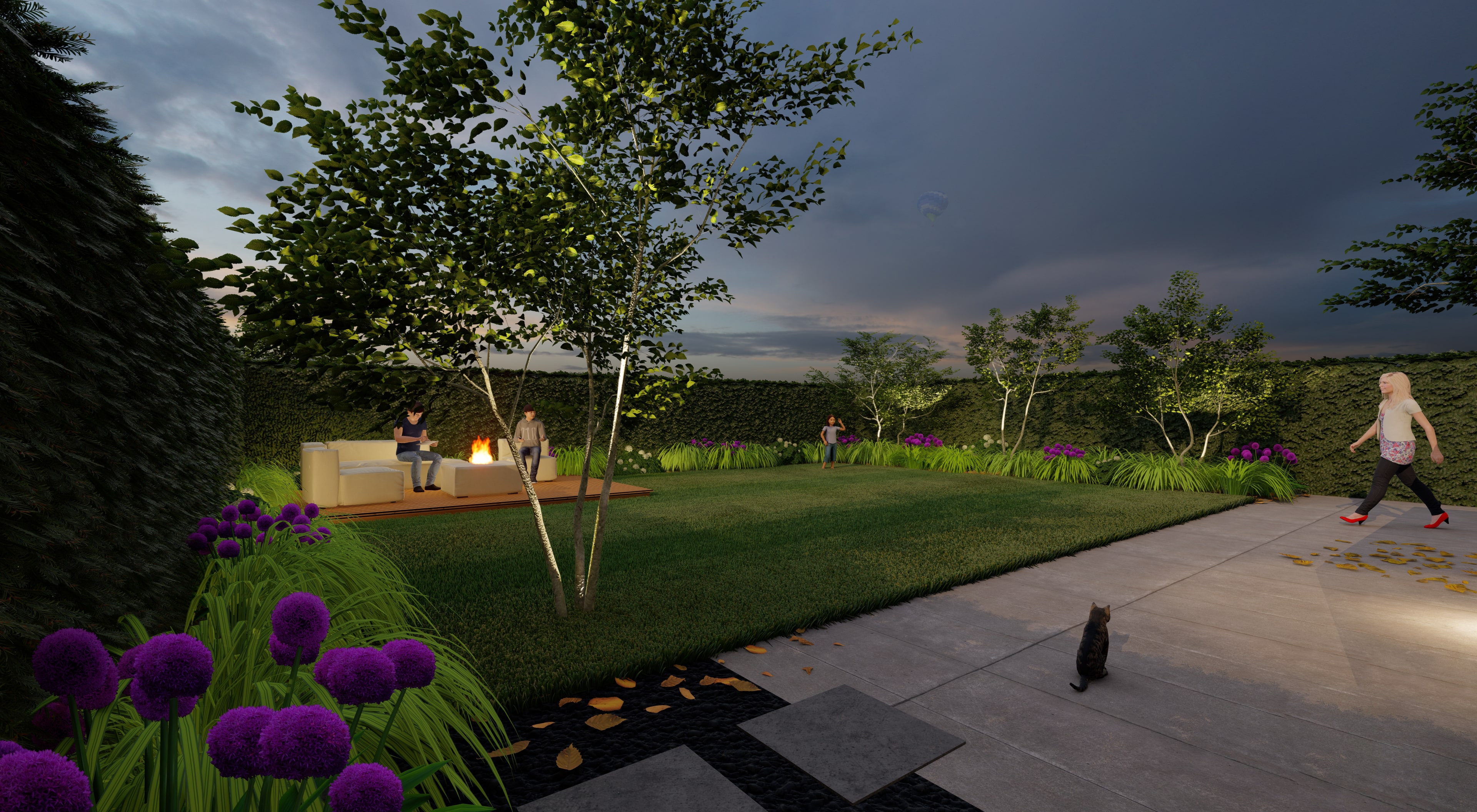 Die klaren Formen des Hauses im Bauhausstil werden im Garten fortgeführt. Das großzügige Holzdeck aus Sibirischer Lärche dient als komfortable Lounge. Die Reihe aus mehrstämmigen Felsenbirnen bricht die klaren Linien auf und dient als Kontrast. Dessen immergrüne Unterpflanzung aus Seggen gibt dem Garten Struktur und wird durch Gruppen aus weißen Horstensien aufgehellt.