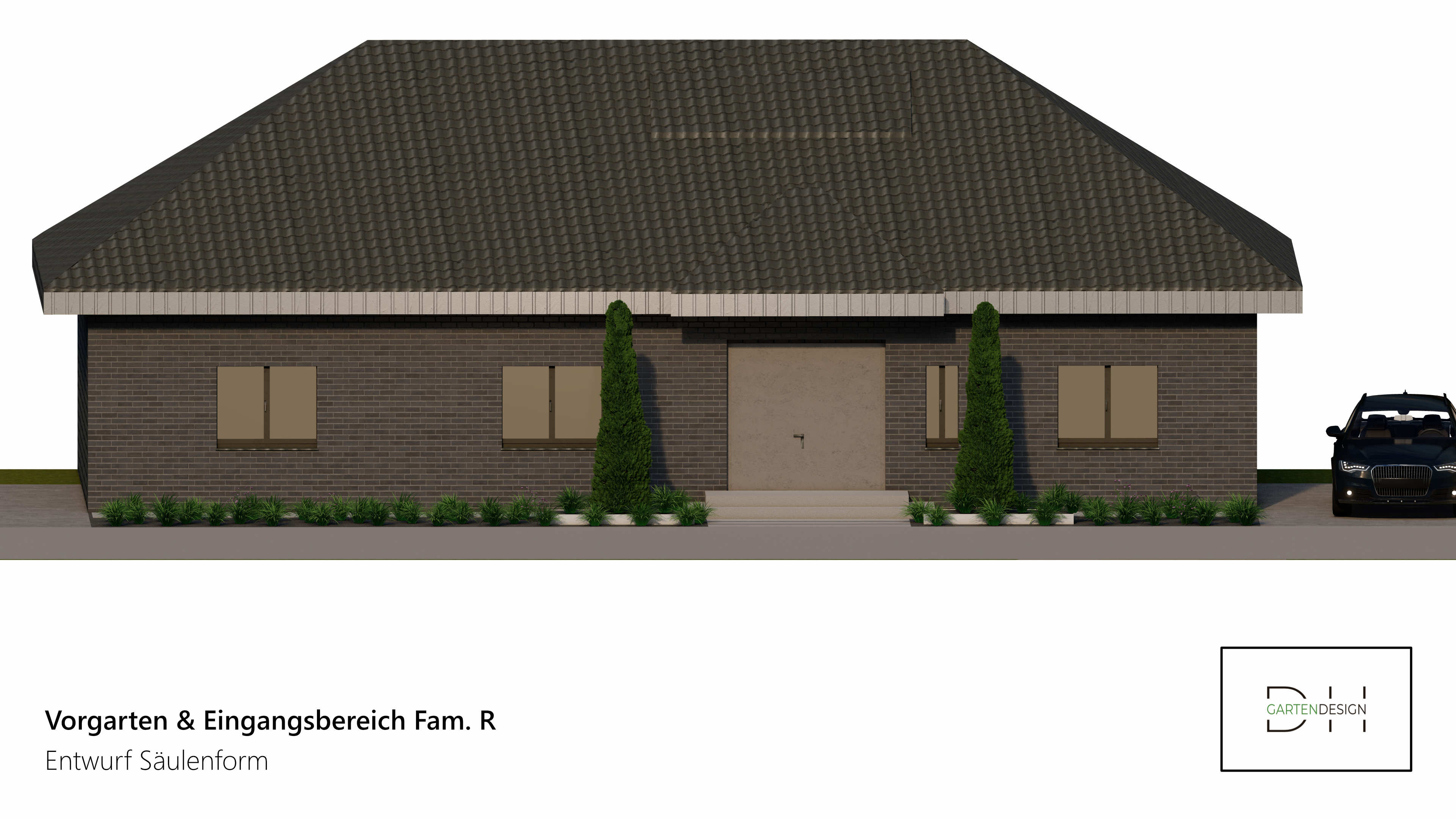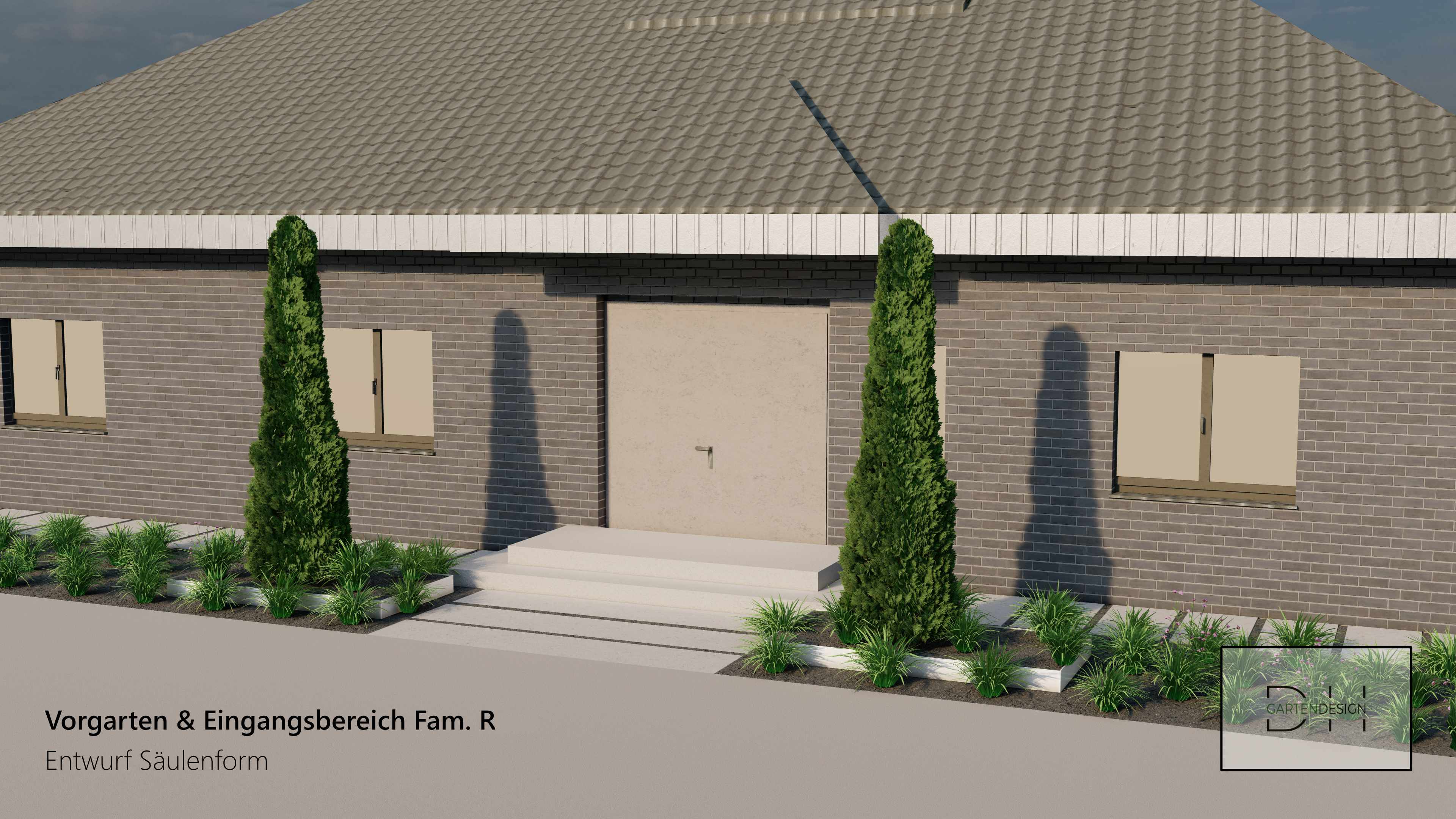 Der Stil des Vorgartens in einem Wohngebiet in Dülmen orientiert sich an der minimalistischen und kontraststarken Architektur des Hauses. Granit Keramikplatten werden als Schrittplatten in einem Bett aus anthraziten Lava Substrat verlegt. Edelstahl Hochbeete mit zwei Säuleneiben stärken den Eingangsbereich. Die Bepflanzung erfolgt in einem Raster aus Gräsern und kleinen Gruppen aus Salbei und Verbenen. Für Frühjahrsaspekte sorgen schwarze Tulpen und Zierlauch.